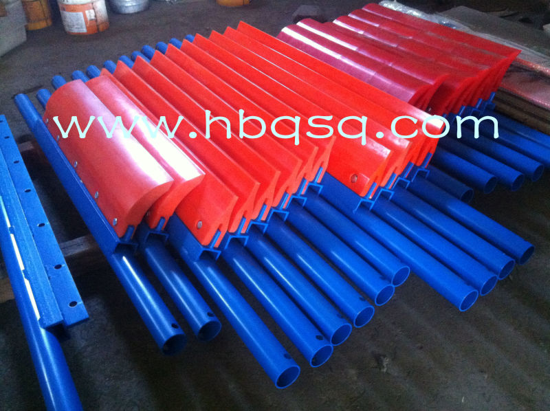 聚氨酯清掃器主要作用是清掃運輸皮帶表面的附著物,在輸送機上有著不可忽視的作用,靠皮帶傳動的生產(chǎn)線基本都需要靠它來對皮帶或輸送帶進行清掃。 清掃器我國的發(fā)展和起步都比較晚,被引進國內(nèi)之后隨著市場和工廠設(shè)備的需求得到了相應的開發(fā),現(xiàn)隨著近幾年產(chǎn)業(yè)和清掃器的研發(fā)力度加大,一些企業(yè)產(chǎn)品的質(zhì)量和技術(shù)水平已經(jīng)達到或接近國際水平 。 帶式輸送機輸送物料時若輸送帶上殘留或附著物料或者其他物質(zhì)如果沒有清掃器的協(xié)助這些東西就很容易的能進入到輸送機滾筒或托輥軸承座內(nèi)部使軸承磨損嚴重、滾筒或托輥表面這樣會縮短皮帶的使用壽命造成皮帶表面磨損和斷裂。如果給運輸設(shè)備配上清掃裝置則能很有效的保護皮帶以及運輸設(shè)備其他的部件能提高設(shè)備的有效使用時間。所以清掃器的清掃能力對提高帶式輸送機的運行效率和使用壽命以及減少設(shè)備故障率和降低維護成本有著至關(guān)重要的作用,膠帶輸送機必備配件。